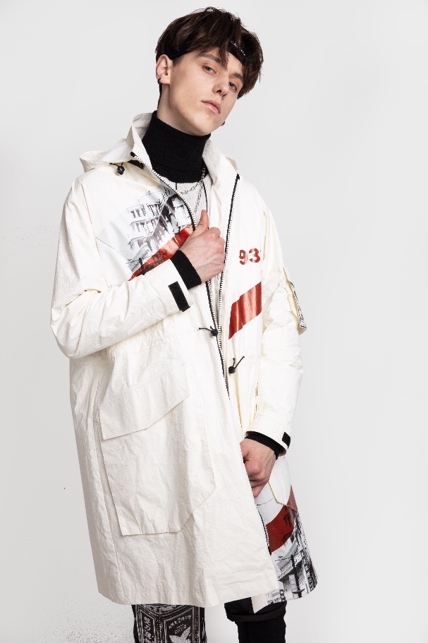主題下分為三個(gè)系列,第一個(gè)系列是情報(bào)系列,也是特色系列。為此我專門去上圖查閱了新民晚報(bào)在建國后的期刊,搜集創(chuàng)作素材,結(jié)合over size的潮流設(shè)計(jì)了報(bào)紙素材拼貼襯衫,紙質(zhì)肌理的老上海街景燙畫輕質(zhì)風(fēng)衣等。第二個(gè)系列是霓虹系列,靈感來源于百樂門,南京路的夜景,因?yàn)橐股钍枪沤裆虾W罹叽硇缘姆栔唬饕ㄟ^解構(gòu)主義印花的方式呈現(xiàn)。第三個(gè)系列是夜光系列,靈感來源于梅雨季節(jié)的路面星光,燈紅酒綠支離破碎的倒影,主要以各類熒光色條紋的重組作為圖案.